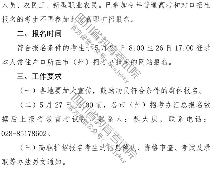 通知明确,高职扩招第二阶段补报名时间为5月24日8:00至26日17:00,符合报名条件的考生登录本人常住户口所在市(州)招考办指定的网站报名。已参加今年普通高考和对口招生报名、高职扩招高考第一阶段补报名的考生不再参加此次高职扩招报名。